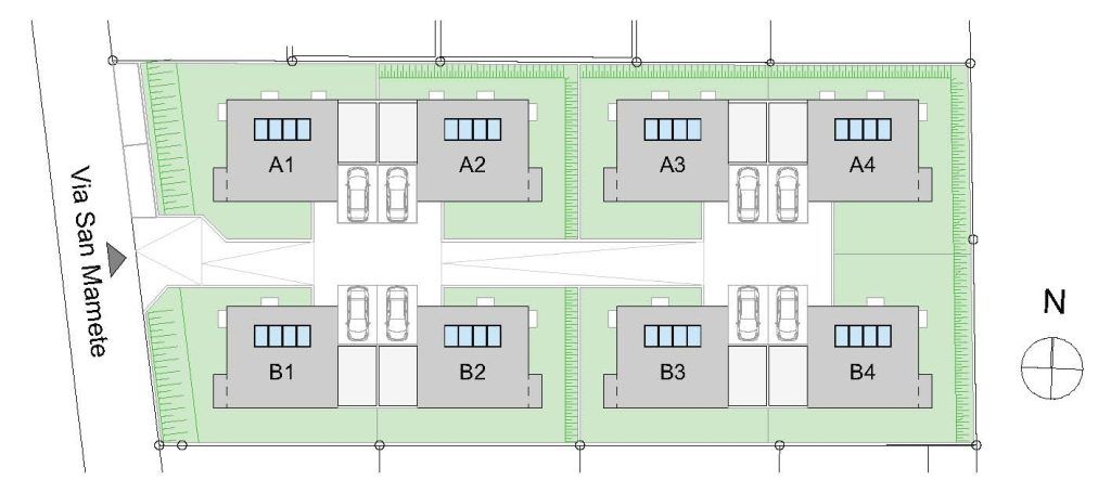 L’accesso al nuovo complesso residenziale è posizionato sul lato Ovest del mappale, con ingresso da via San Mamete. Da qui si sviluppa una strada privata centrale, progettata per garantire una circolazione agevole e sicura, collegando in modo diretto tutte le 8 unità abitative.